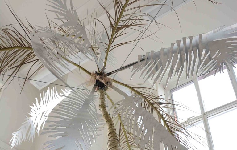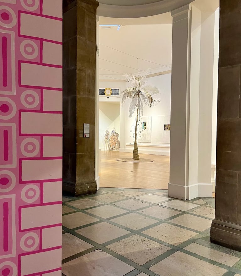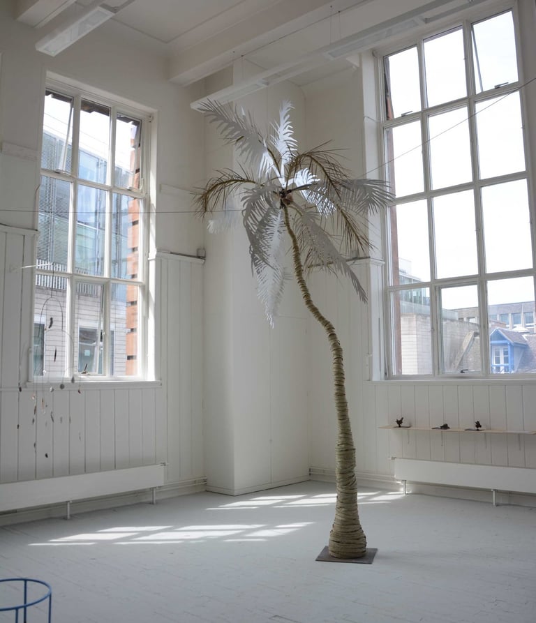 On the subject of large-scale work fitting in, Fiona Goss’ (ECA) Palm of Possibility, made from steel, aluminium, woven borassus, palm and jute fibres, does everything apart from wave in the wind. It reminded me of George Wyllie’s Adjustable Palm Trees, inspired by his childhood visits to the People’s Palace and Winter Gardens on Glasgow Green. I loved it and felt minded to sit under it and read my book, but alas a bus was waiting for me…